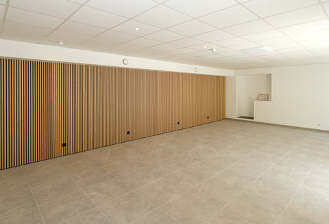 Installation de panneaux d'habillages acoustiques en tasseaux de bois.